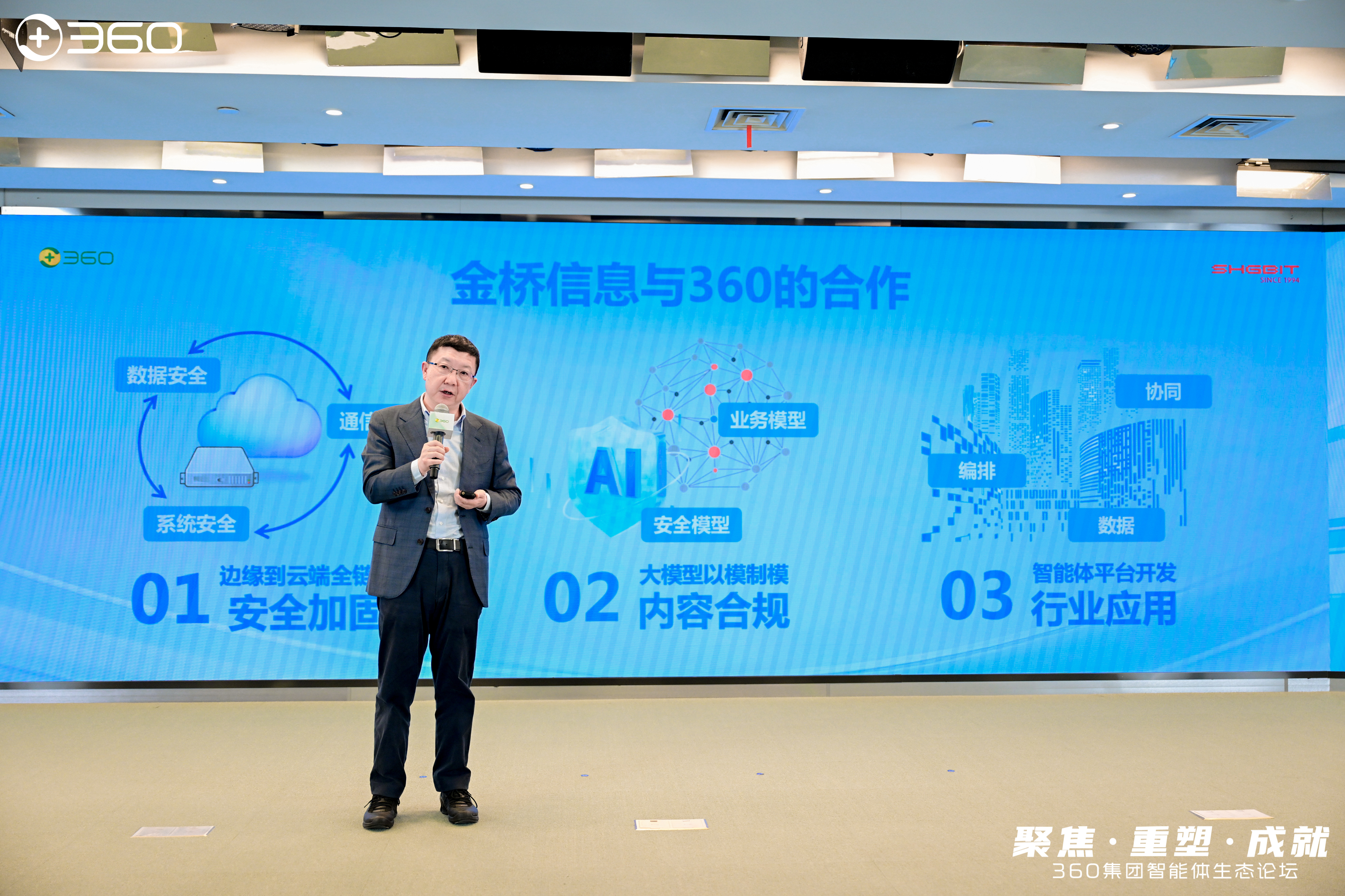 在全体嘉宾见证下,金桥信息与360集团正式签署战略合作协议。这一重要合作标志着双方将围绕智能体平台开发、行业解决方案融合、数据安全协同等方向展开全方位合作,共同推动智能体技术在政务、司法、教育等重点行业的创新应用。